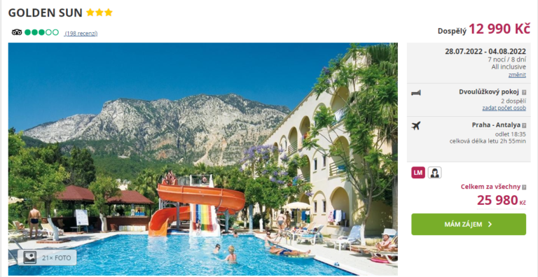 Máte sbalené kufry a jen čekáte na tu správnou nabídku? Co takhle dovolená v Turecku? Díky nabídce cestovní kanceláře si můžete užít týdenní dovolenou v tříhvězdičkovém hotelu, který se nachází nedaleko pláže. Zájezd pořídíte za cenu 12 990 Kč. V této ceně jsou zahrnuty letenky (s odletem z Prahy), letištní transfery v místě, ubytování na 7 nocí, stravování formou All Inclusive a služby delegáta. Rady a tipy na výlety najdete v našem online průvodci Tureckem.