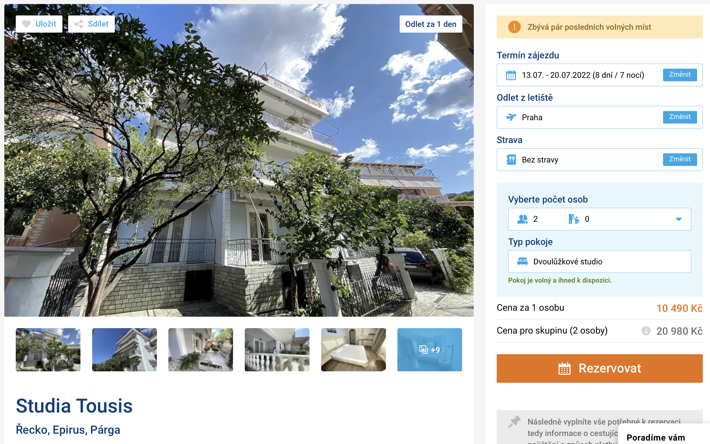 Čeká vás v následujících dnech volno, ale stále jste neobjevili žádný zájezd? Inspirujte se naším dnešním tipem a užijte si parádní dovolenou v řeckém Epiru. Výborně hodnocená studia se nachází v centru starobylé Pargy, přibližně 10 minut od pláže. V ceně 10 490 Kč jsou zahrnuty letenky (s odletem z Prahy), letištní transfery v místě, ubytování a služby delegáta. S rezervací příliš dlouho neváhejte, odlet je již zítra 13.7. 2022.