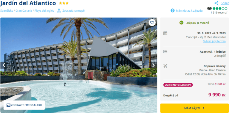 V nabídce cestovní kanceláře Fischer zlevnil last minute zájezd na Gran Canarii. V ceně 9990 Kč za osobu jsou zahrnuty letenky, služby delegáta, letištní transfery i ubytování na týden (bez stravování). Hotel se nachází v centru Playa del Inglés a jen cca 400 metrů od prostorné písčité pláže.