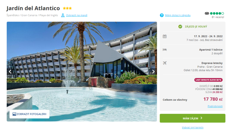Rádi byste se vydali na Kanárské ostrovy? Díky nabídce cestovní kanceláře se můžete vydat na Gran Canarii již za pár dní. Zájezd do skvěle hodnoceného hotelu pořídíte za úžasných 8 890 Kč. Tato cena zahrnuje zpáteční letenky s odletem z Prahy, transfery z letiště v místě pobytu, služby českého delegáta a ubytování v hotelu na 7 nocí. Hotel je situován v centru střediska Playa del Inglés ve vzdálenosti asi 300 m od nákupních středisek Plaza a Kasbah. Rady a tipy na výlety najdete v našem online průvodci ostrovem Gran Canaria.