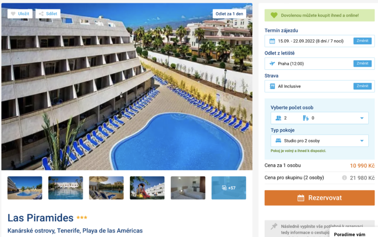 Už zítra můžete navštívit ostrov Tenerife a oblíbené letovisko Playa de las Americas. Zájezd do 3* hotelu pořídíte za last minute cenu 10 990 Kč. V ceně jsou zahrnuty letenky (odlet z Prahy), letištní transfery v místě, ubytování na 7 nocí, all inclusive stravování a služby delegáta. Hotel se nachází přímo v centru letoviska, přibližně 700 metrů od pláže. Před cestou se nezapomeňte inspirovat v našem online průvodci Tenerife, ve kterém najdete tipy na výlety a informace o ostrově.