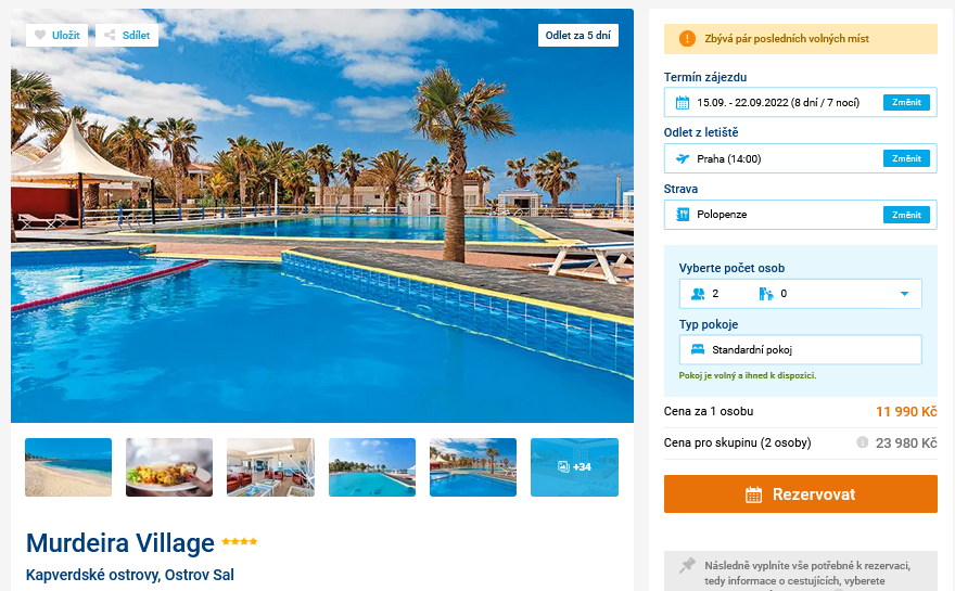 Podzim už klepe na dveře, a proto je nejvyšší čas utéct před sychravým počasím k moři. S naším dalším tipem se můžete podívat na Kapverdy a to hned za 5 dní. V ceně 11 990 Kč se vám cestovní kancelář postará o ubytování v hotelu na 8 dní, polopenzi, zpáteční letenky z Prahy, letištní transfery a služby delegáta. Murdeira Village Resort najdete v klidné destinaci na oblíbeném ostrově Sal. S rezervací se příliš dlouho nerozmýšlejte. Odlet je již 15.9.2022 a zbývá posledních pár míst.