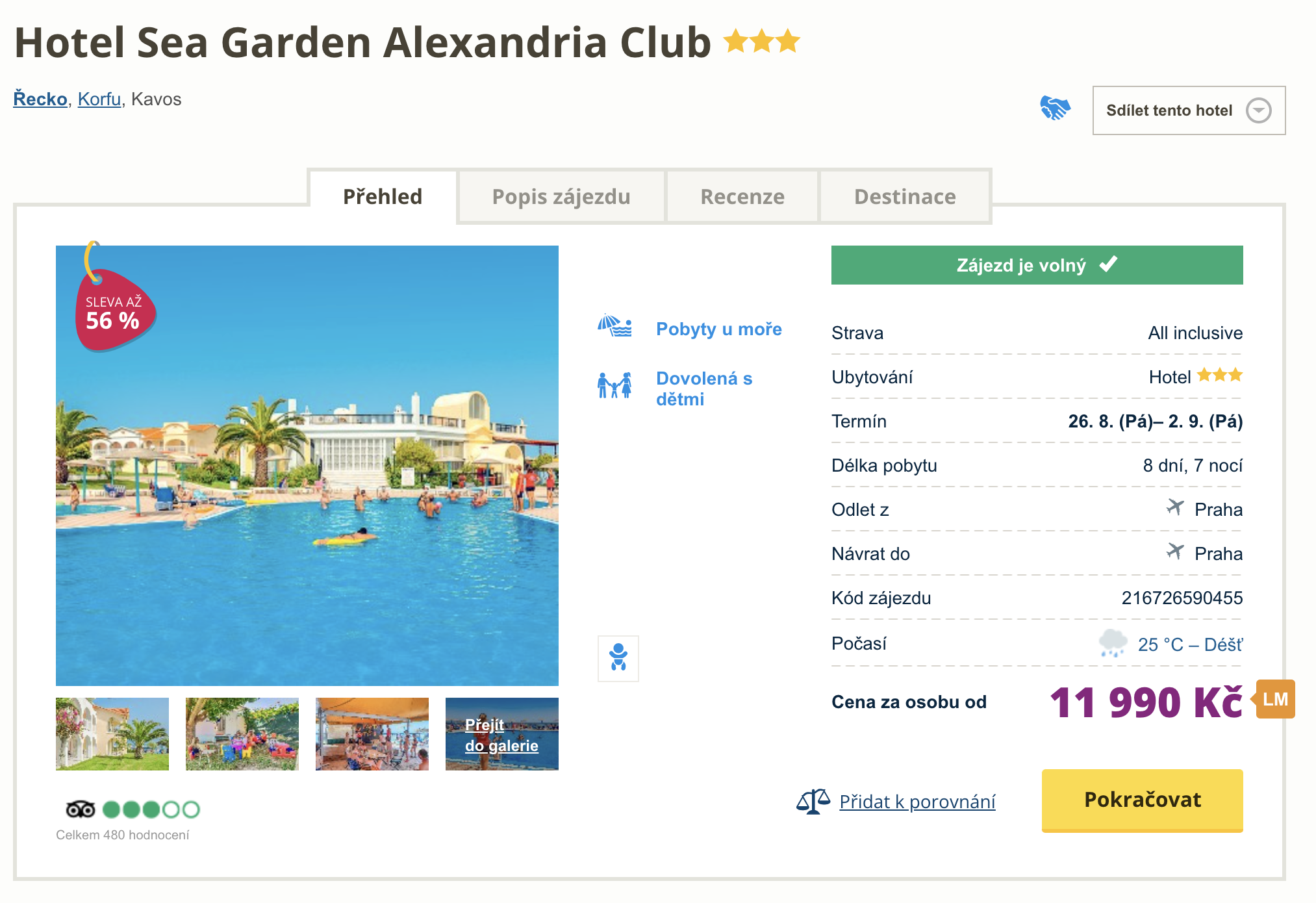 Už zítra si můžete užívat krásných pláží na řeckém ostrově Korfu! Zájezd do letoviska Kavos můžete aktuálně pořídit za cenu 11 990 Kč. V této ceně jsou zahrnuty letenky, letištní transfery v místě, ubytování v hotelu, stravování formou all inclusive a služby delegáta. Hotel se nachází přímo u písčité pláže, na které můžete zdarma využívat lehátka i slunečníky. Před cestou určitě nahlédněte do našeho online průvodce Korfu, ve kterém najdete tipy na výlety a informace o ostrově.