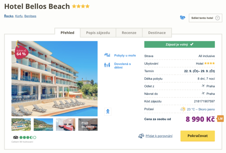 Už zítra můžete vyrazit na krásný řecký ostrov Korfu! Zájezd do hotelu Bellos Beach v letovisku Benitses pořídíte za cenu 8 990 Kč. V této ceně jsou zahrnuty letenky (odlet z Prahy), letištní transfery v místě, ubytování na 7 nocí, stravování formou all inclusive a služby delegáta. Hotel se nachází přímo u oblázkové pláže s průzračnou vodou. Hotel je dle recenzí vhodný pro méně náročné cestovatele, kteří si chtějí užít poklidnou dovolenou. Před odletem se nezapomeňte inspirovat v našem podobném průvodci ostrovem, ve kterém najdete tipy na výlety.