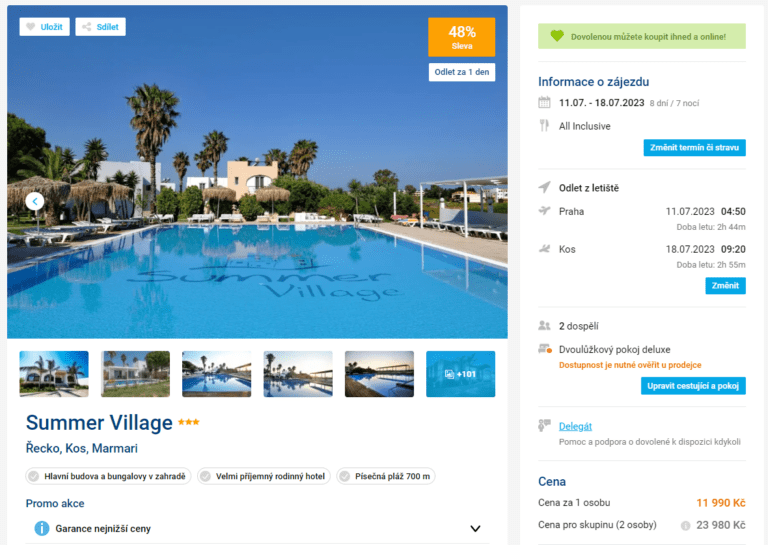 Pokud vám zítra začíná dovolená, ale ještě se nenašel akční zájezd, který by vám padl do oka, mohl by to napravit následující tip! V něm vám ukážeme týdenní pobyt na ostrově Kos, který po slevě seženete jen za 11 990 Kč. Odlet je z dobře dostupné Prahy, či Brna a cena zahrnuje ubytování v dobře hodnoceném 4* hotelu s programem All Inclusive, zpáteční letenky, letištní transfery a služby delegáta. S nákupem se moc dlouho nerozmýšlejte, předpokládáme, že bude brzy pryč.