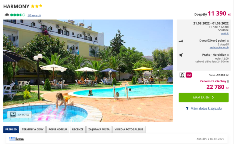 Dovolenou v hotelu Harmony v termínu 21.8. – 1.9. 2022 můžete rezervovat zde >> (recenze hotelu najdete zde >>)