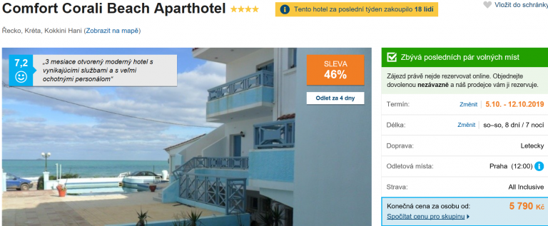 Užijte si bezstarostnou dovolenou a poznejte krásy řecké Kréty. Zájezd s cestovní kanceláří nyní zakoupíte za skvělých 5790 Kč! V této ceně máte kompletní dovolenou – letenku z Prahy (tam i zpět), dopravu na místě, služby delegáta, ubytování ve 4* hotelu a stravování formou All Inclusive po celých 8 dní. Podrobného průvodce po Krétě zdarma naleznete zde. Zájezd je téměř vyprodaný, proto v případě zájmu s rezervací určitě neotálejte!