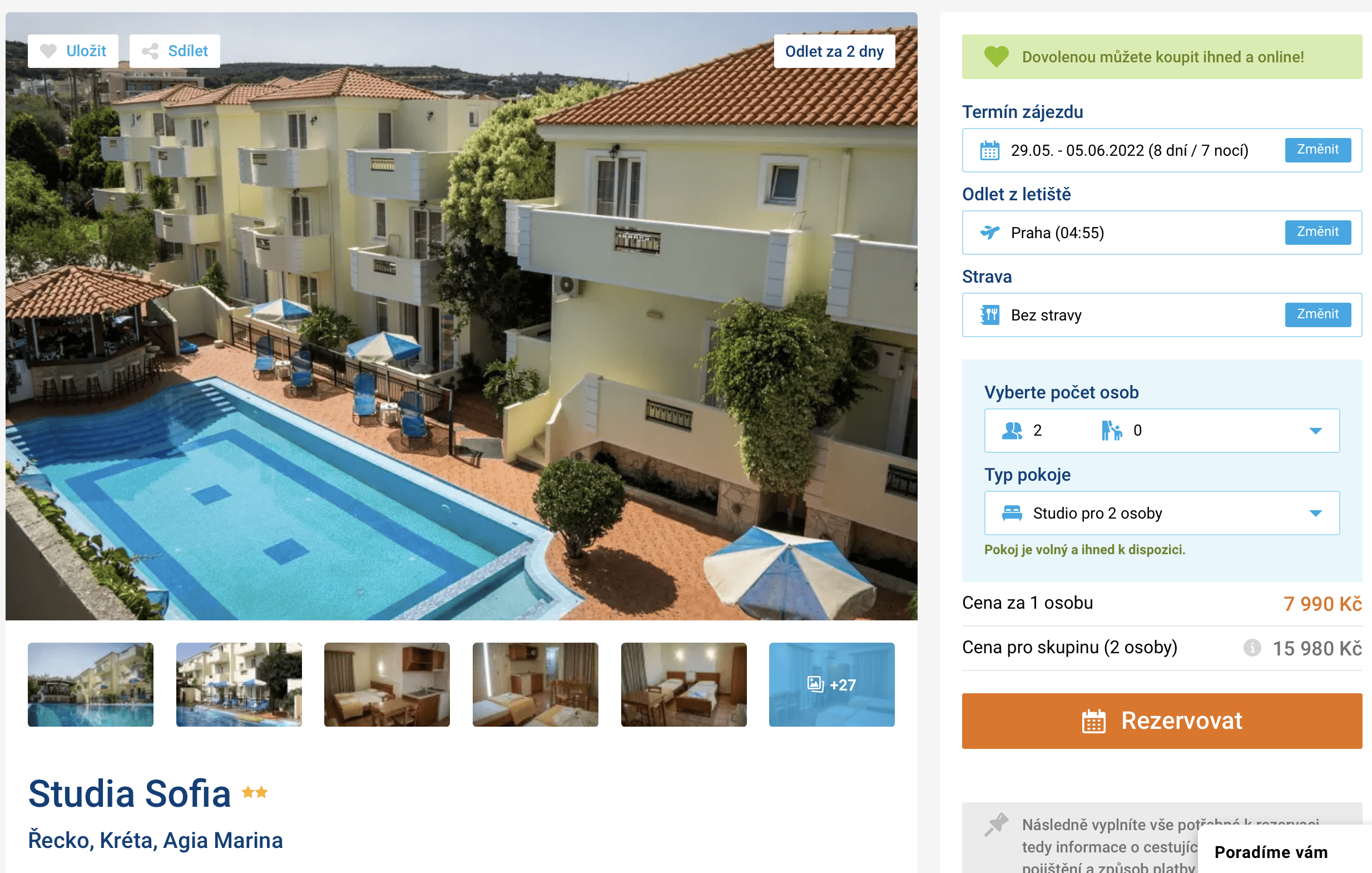 Jsou vaší oblíbenou destinací řecké ostrovy? Navštivte řecký ostrov Kréta za cenu 7 990 Kč! V této ceně je zahrnuta zpáteční letenka z Prahy, letištní transfery v místě, ubytování ve skvěle hodnocených studiích a služby delegáta. Komplex se nachází nedaleko centra letoviska Agia Marina, přibližně 50 metrů od pláže. Před cestou nezapomeňte nahlédnout do našeho průvodce Krétou, kde najdete tipy na výlety a informace o ostrově.