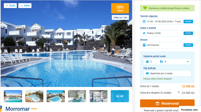 Užijte si dovolenou na Lanzarote! Využijte akční nabídky a vyrazte na organizovaný pobyt s cestovní kanceláří, kde budete mít zajištěno vše potřebné. Dovolená vás vyjde na 12 490 Kč a zahrnuje ubytování v hotelu na 8 dní, stravu All Inclusive, zpáteční letenky z Prahy, letištní transfery a služby delegáta. Hotel Morromar patří mezi skvěle vybavené resorty. Najdete zde restauraci, bar i minimarket. V blízkém okolí pak můžete navštívit centrum letoviska Puerto del Carmen.