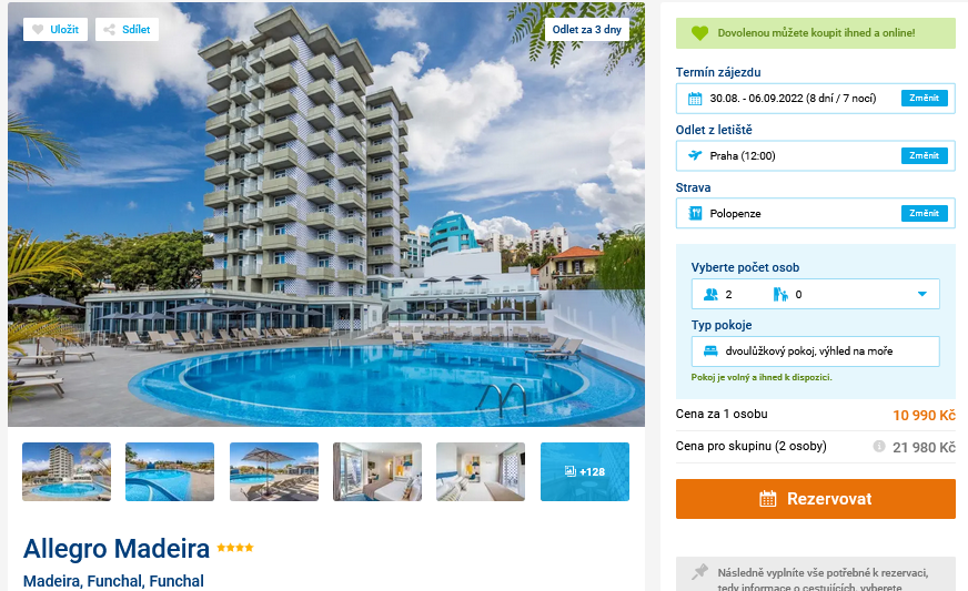 Prodlužte si léto a vyrazte s cestovní kanceláří na Madeiru! Zájezd vás vyjde na 10 990 Kč a tato cena zahrnuje ubytování na 8 dní s polopenzí, zpáteční letenky z Prahy, letištní transfery a služby delegáta. Hotel Allegro Madeira se nachází ve městě Funchal, poblíž hlavní turistické třídy. Inspiraci na výlety můžete načerpat v našem podrobném průvodci Madeirou, ve kterém najdete mnoho rad a tipů.