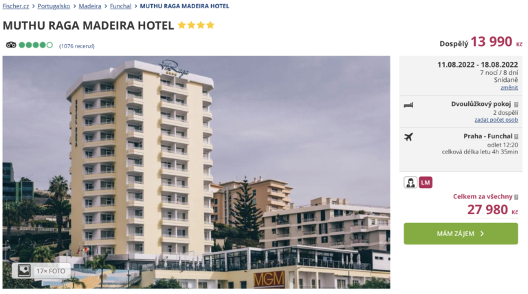 Inspirujte se naším dnešním tipem a navštivte Madeiru, ostrov věčného jara. Madeira láká na svou nádhernou přírodu, hory a mnoho turistických tras. Zájezd do 4* hotelu můžete aktuálně pořídit za cenu 13 990 Kč. V této ceně jsou zahrnuty letenky (odlet z Prahy), letištní transfery v destinaci, ubytování na 7 nocí, snídaně a služby delegáta. Hotel se nachází kousek od centra města a v jeho okolí najdete kavárny, restaurace i bary. Před cestou nezapomeňte nahlédnout do našeho online průvodce Madeirou, ve kterém najdete mnoho rad a tipů pro vaši cestu.