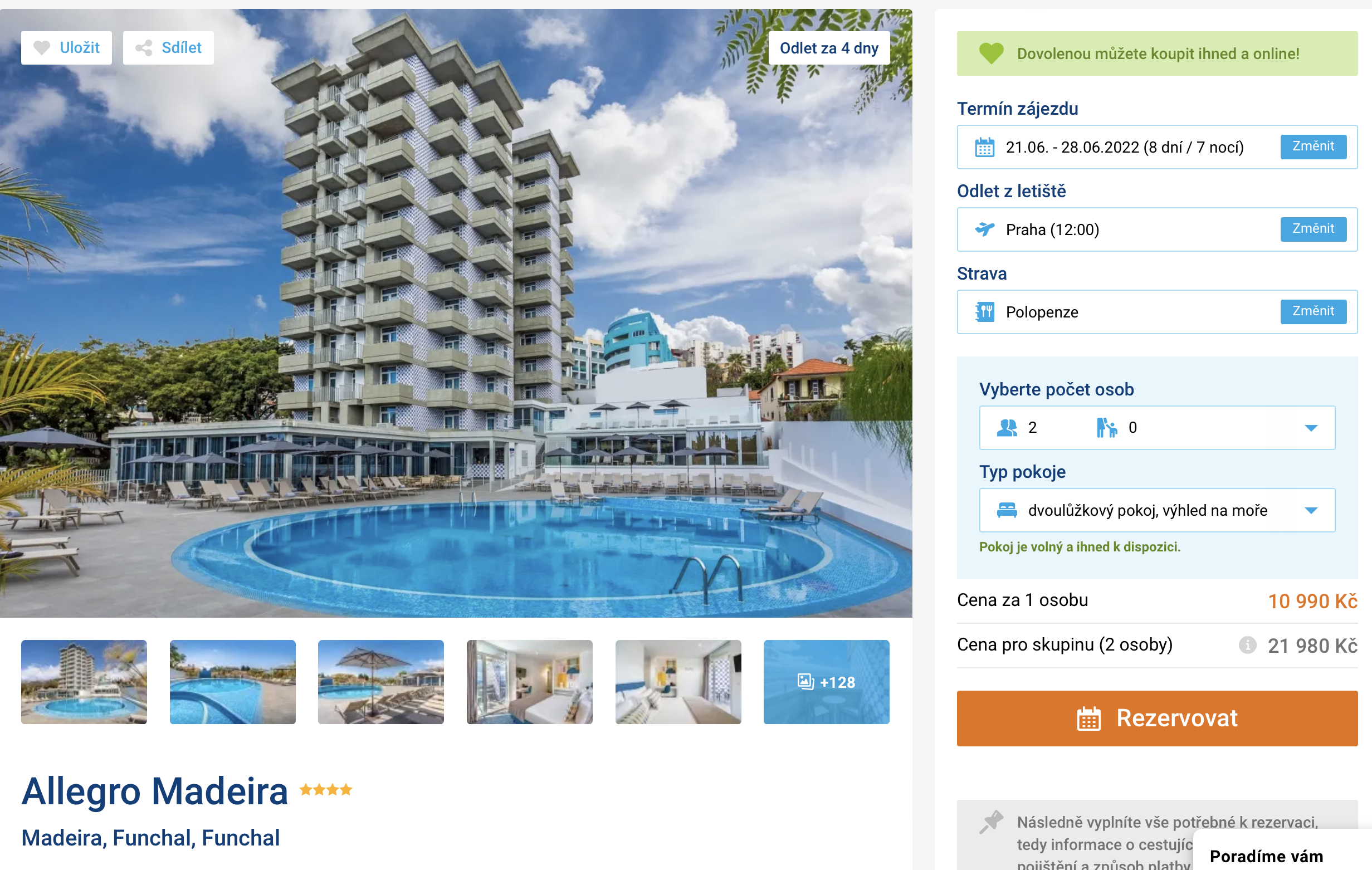 Dopřejte si dovolenou, na kterou budete dlouhá léta vzpomínat a navštivte krásnou Madeiru! Dovolenou ve skvěle hodnoceném 4* hotelu s bazénem a střešní terasou můžete aktuálně pořídit za cenu 10 990 Kč. V této ceně jsou započítány letenky, letištní transfery v místě, ubytování na 7 nocí, stravování formou polopenze a služby delegáta. Hotel se nachází v hlavním městě Funchal. Před cestou nezapomeňte nahlédnout do našeho online průvodce Madeirou, ve kterém najdete inspiraci na výlety po ostrově.