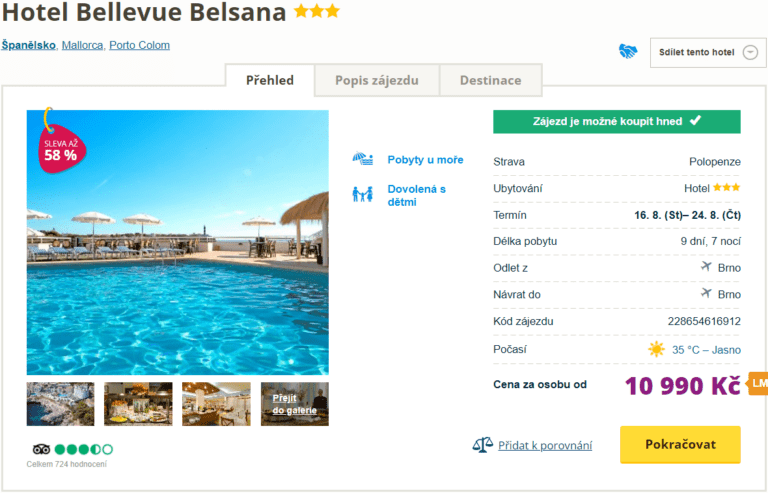 Čekáte na last minute nabídku a jste připraveni vyrazit už zítra? Máme tip na zlevněný zájezd na Mallorcu za 10990 Kč na osobu. Cena zahrnuje letenky z Brna, letištní transfery, služby delegáta a ubytování na týden s polopenzí. Hotel má krásný výhled na moře, pláž je vzdálena 700 metrů a centrum městečka Porto Colom také 700 metrů. V blízkosti hotelu najdete obchody i restaurace. Před cestou se inspirujte v našem průvodci ostrovem Mallorca.