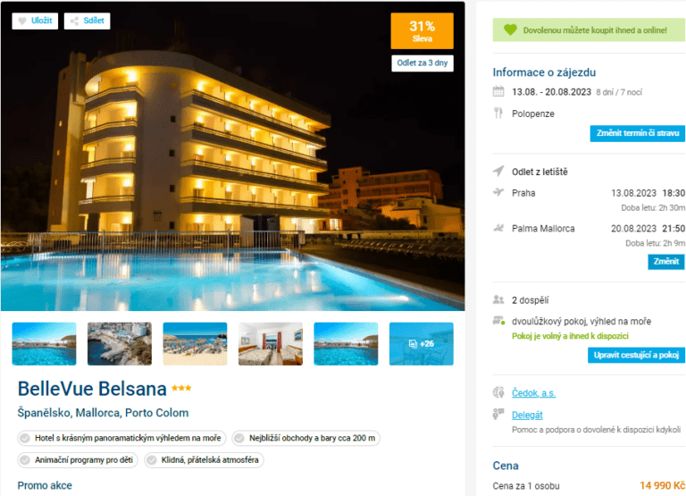 V nabídce Čedoku zlevnil last minute zájezd na Mallorcu. Cena 14990 Kč zahrnuje klasický balíček obsahující jak letenky (s odletem z Prahy), tak služby delegáta, letištní dopravu v destinaci a ubytování na týden s polopenzí. Hotel má krásný výhled na moře a od nejbližší pláže je vzdálen 700 metrů. Nabídka se hodí především pro rodiny s dětmi (hotel nabízí např. animační programy). Před cestou nahlédněte do našeho průvodce Mallorcou, kde najdete spoustu cestovatelských tipů.