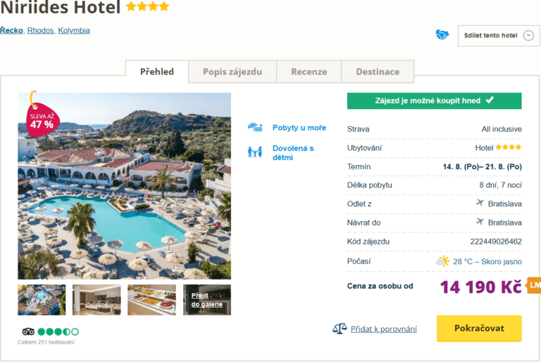 V nabídce Čedoku se objevil zlevněný last minute zájezd na řecký ostrov Rhodos. V ceně 14190 Kč za osobu jsou zahrnuty letenky (odlet z Bratislavy), služby delegáta, letištní doprava a týdenní ubytování ve 4* resortu s All Inclusive. Hotel je situován u centra letoviska Kolymbia a 500 metrů od pláže. Před cestou nezapomeňte nahlédnout do našeho průvodce Rhodosem.