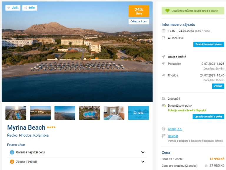 Přinášíme další tip na levnou dovolenou, tentokrát na řecký ostrov Rhodos. V nabídce Čedoku zlevnil last minute zájezd s odletem už zítra! V ceně 13990 Kč za osobu jsou zahrnuty letenky, služby delegáta, letištní transfery v cíli a ubytování na týden s All Inclusive. Hotel se nachází přímo u pláže a nabízí bohaté vyžití pro dospělé i děti. Před cestou nahlédněte do našeho průvodce Rhodosem, kde najdete spoustu cestovatelských tipů.