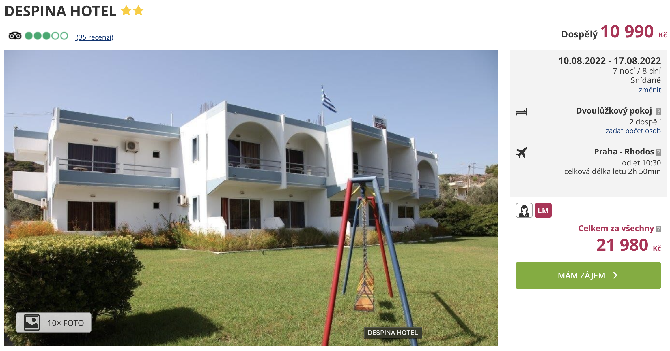 Inspirujte se naším tipem a navštivte řecký ostrov Rhodos. Zájezd do letoviska Afandou můžete aktuálně pořídit za cenu 10 990 Kč. Tato cena zahrnuje letenky (odlet z Prahy), letištní transfery v destinaci, ubytování na 7 nocí a služby delegáta. Zájezd dále zahrnuje i snídaně, nebudete tak vázáni hotelovým stravovacím režimem a celý den můžete objevovat zajímavá místa na ostrově. Před cestou nezapomeňte načerpat inspiraci v našem online průvodci Rhodosem, ve kterém najdete tipy na výlety a informace o ostrově.