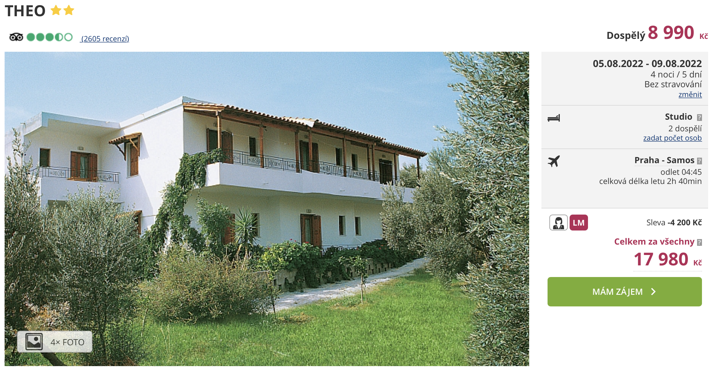 Na tento zájezd jsme vás již upozorňovali. Pokud stále váháte zda nadcházející víkend strávit u moře, určitě vás potěší informace, že zájezd zlevnil. Pětidenní zájezd na řecký ostrov Samos teď můžete pořídit za částku 8 990 Kč. Tato cena zahrnuje letenky (s odletem z Prahy), letištní transfery v místě, ubytování ve studiu na 4 noci a služby delegáta. Před cestou nezapomeňte nahlédnout do našeho online průvodce ostrovem Samos, ve kterém najdete rady a tipy pro vaši cestu.
