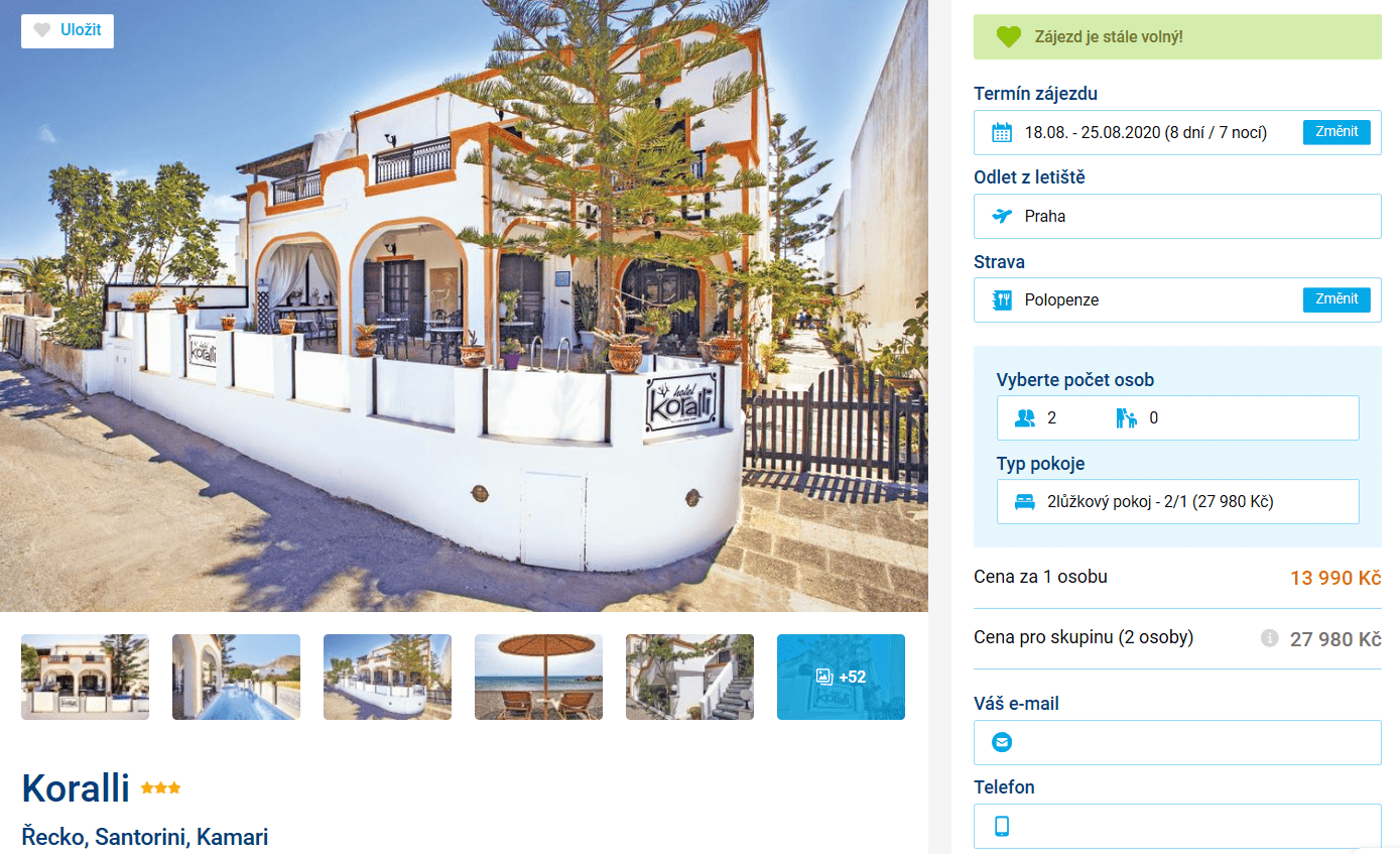 Rádi byste si užili dovolenou v obklopení krásného moře, úzkých uliček plných voňavých květů a dech beroucích výhledů na západy slunce? Pak si nenechte ujít akční nabídku cestovní kanceláře a vyrazte již za týden na řecké Santorini. V ceně 13 990 Kč máte zpáteční letenku z Prahy, dopravu na místě, služby delegáta, ubytování a polopenzi na celých 8 dní. Inspiraci na výlety můžete načerpat v našem podrobném průvodci zdarma.