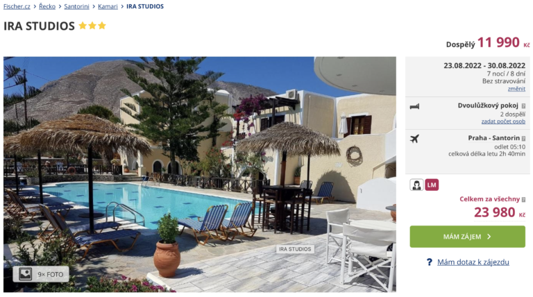 Toužíte po návštěvě romantického ostrova Santorini? Díky našemu dnešnímu tipu si tento sen můžete splnit už zítra. Zájezd na Santorini aktuálně pořídíte za cenu 11 990 Kč. Tato cena zahrnuje letenky (odlet z Prahy), letištní transfery v místě, ubytování na 7 nocí a služby delegáta. Studia Ira najdete v oblíbeném letovisku Kamari, nedaleko promenády. Určitě nezapomeňte nahlédnout do našeho online průvodce Santorini , ve kterém najdete informace o ostrově a tipy na výlety.