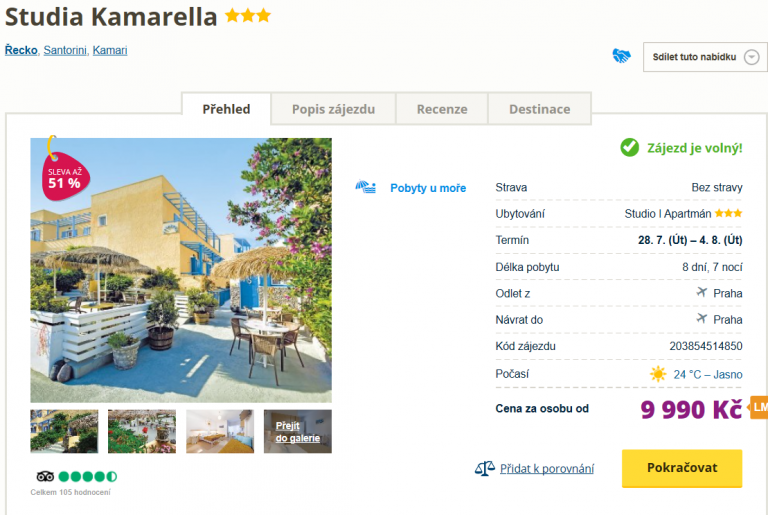 Prázdniny se pomalu, ale jistě, chýlí do své poloviny a vy jste stále nevyrazili na dovolenou k moři? Nevadí! Možná by vám mohla padnout do oka právě tato nabídka, která vás za 9990 Kč zavede již následující úterý na oblíbené Santorini. V ceně zájezdu máte zahrnuty zpáteční letenky z Prahy, dopravu na místě, služby delegáta a ubytování na 8 dní. Strava v balíčku zahrnuta není. Podrobného průvodce po Santorini zcela zdarma si můžete přečíst zde.