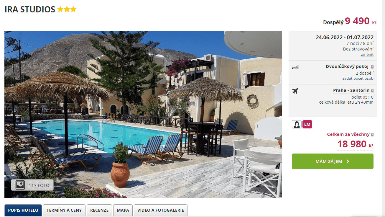Rádi byste navštívili romantický řecký ostrov Santorini? Díky našemu akčnímu tipu si na tomto ostrově můžete užít dovolenou ve výborně hodnoceném hotelu, a to za skvělých 9 490 Kč. V ceně je zahrnuta zpáteční letenka z Prahy, letištní transfery v místě, ubytování a služby delegáta. Tradiční hotelový komplex se nachází v klidné části oblíbeného letoviska Kamari. Rady a tipy na výlety najdete v našem online průvodci ostrovem Santorini.