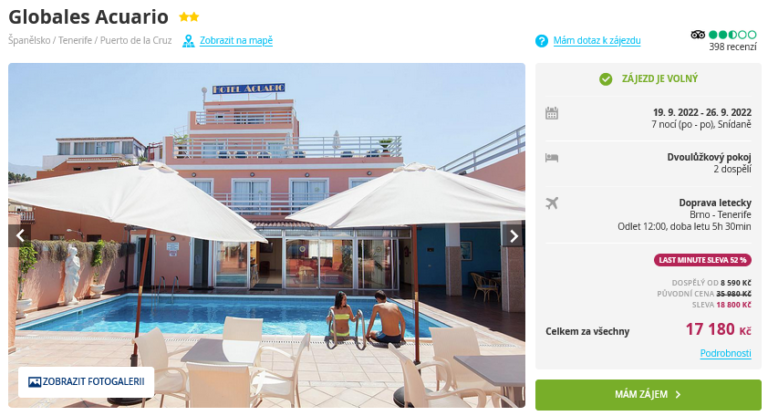 Nechte se zlákat na pohodovou dovolenou u moře! S naším tipem můžete již za několik dní obdivovat krásy ostrova Tenerife a užít si ničím nerušený odpočinek. V ceně 8 590 Kč je zahrnuto ubytování v hotelu se snídaní, zpáteční letenky z Brna, letištní transfery a služby delegáta. Pokud byste uvítali polopenzi, zájezd vás vyjde na 9 490 Kč. Ubytováni budete v hotelu Globales Acuario, který se nachází v oblíbeném letovisku Puerto de la Cruz. Před cestou se nezapomeňte inspirovat v našem online průvodci tímto ostrovem, ve kterém najdete tipy na výlety.