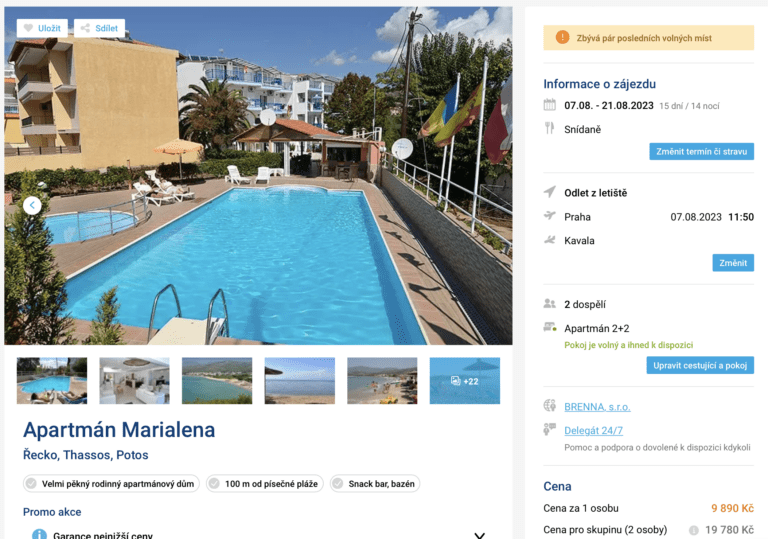 Láká vás řecký ostrov Thassos? V nabídce cestovní kanceláře se právě objevil srpnový zájezd na do oblíbeného letoviska Potos za cenu 9 890 Kč. V té jsou zahrnuty letenky (odlet z Prahy), letištní transfery v místě, ubytování na 15 dní, snídaně a služby delegáta. Výborně hodnocené apartmány se pouhých 100 metrů od pláže a do centra letoviska se dostanete za 5 minut chůze. Na stránkách Booking od svých hostů ubytování obdrželo hodnocení 9,6 z 10. Před cestou nezapomeňte nakouknout do našeho podrobného průvodce ostrovem Thassos.