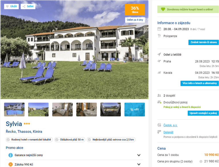Přinášíme tip na last minute dovolenou na řeckém ostrově Thassos. Za cenu 10990 Kč se tam podíváte se vším všudy – v ceně jsou zahrnuty letenky, letištní transfery, delegát i ubytování na týden s polopenzí. Hotel se nachází v jedné z nejhezčích oblastí ostrova s krásnými plážemi. Nejbližší (oblázkovou) pláž najdete přímo u hotelu. Před cestou si přečtěte o Thassosu v našem průvodci.