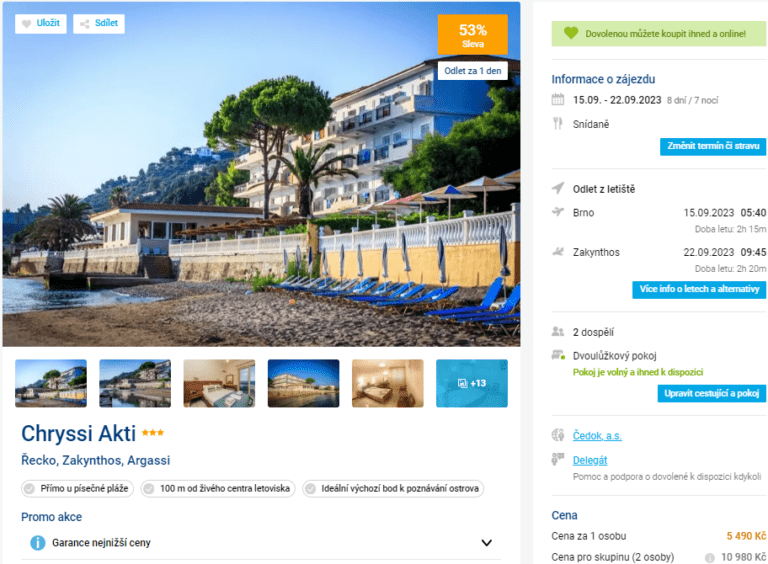 Čekáte na last minute nabídku a jste připraveni vyrazit už zítra brzy ráno? Pak pro vás máme tip na akční zájezd na řecký ostrov Zakynthos jen za 5490 Kč za osobu. Cena zahrnuje kompletní dovolenou včetně letenek, služeb delegáta, letištní dopravy a ubytování na týden se snídaní. Hotel se nachází v živém letovisku Argassi přímo u pláže. Před cestou se inspirujte v našem průvodci ostrovem Zakynthos.