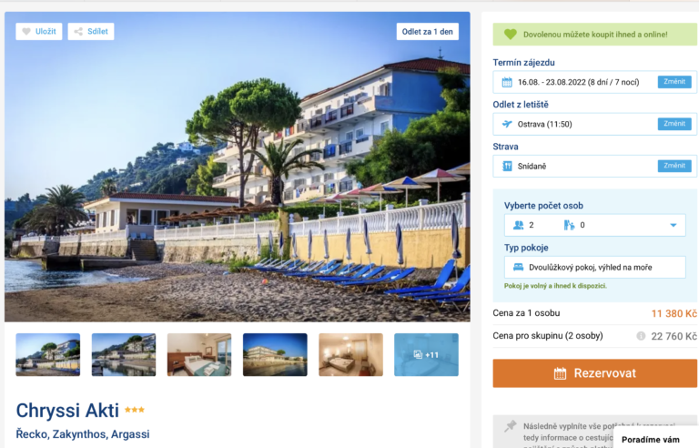 Plánujete letošní dovolenou strávit na řeckých ostrovech a letiště v Ostravě nemáte daleko? Zájezd na Zakynthos můžete aktuálně pořídit za cenu 11 380 Kč. V této ceně jsou zahrnuty letenky (odlet z Ostravy), letištní transfery v místě, ubytování na 8 dní, snídaně a služby delegáta. Výborně hodnocený hotel se nachází nedaleko centra letoviska, přímo u písečné pláže. Před odletem se nezapomeňte inspirovat v našem online průvodci ostrovem Zakynthos, ve kterém najdete tipy na výlety a informace o ostrově.