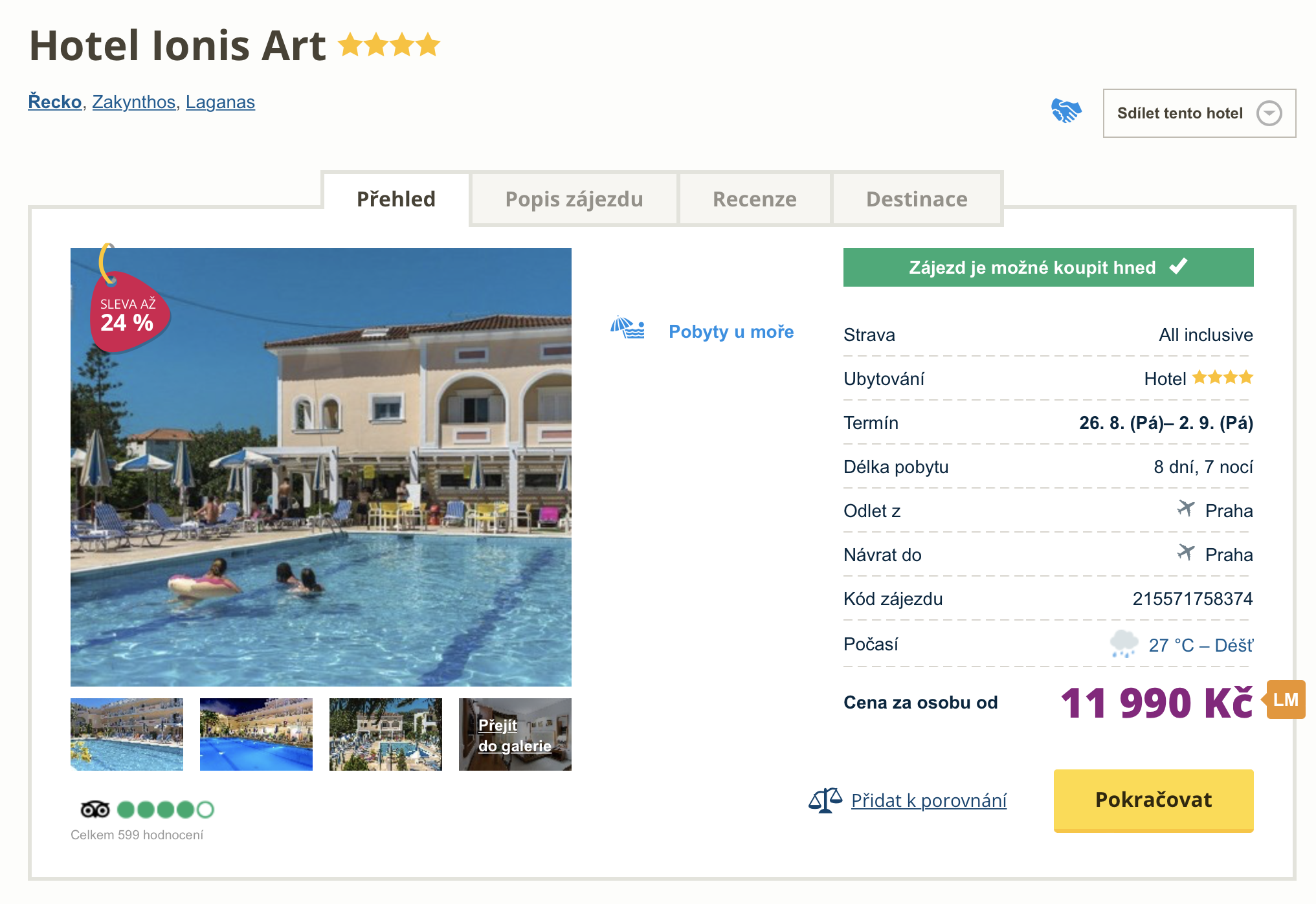 S naším dalším tipem můžete zítra zamířit na řecký ostrov Zakynthos! Využijte last minute nabídku cestovní kanceláře a vydejte se do Řecka za cenu 11 990 Kč. Cena zahrnuje letenky (odlet z Prahy nebo Ostravy), letištní transfery v místě, ubytování na 8 dní, stravování formou all inclusive a služby delegáta. Čtyřhvězdičkový hotel Ionis Art leží ve městě Laganas, v jehož centru najdete mnoho restaurací, barů i obchodů. Před cestou si určitě prohlédněte našeho průvodce ostrovem Zakynthos, aby vám neunikla žádná zajímavá místa v okolí.