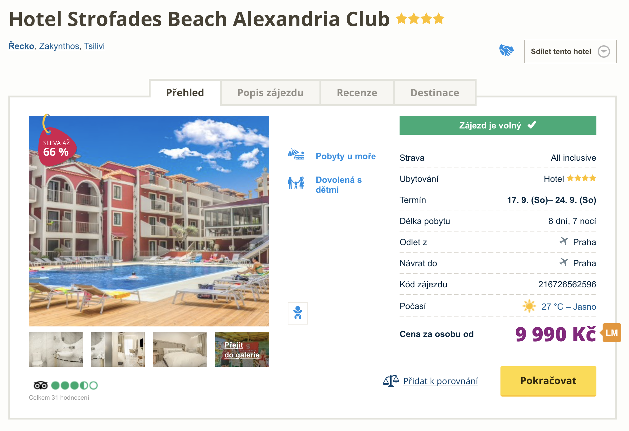 Hledáte dovolenou na poslední chvíli?  Inspirujte se naším dnešním tipem a vydejte se na řecký Zakynthos. Zájezd do 4* resortu pořídíte za cenu 9 990 Kč. Tato cena zahrnuje letenky (odlet z Prahy), letištní transfery v místě, ubytování na 8 dní, all inclusive stravu a služby delegáta. Hotel je situován v klidné části prázdninového letoviska Tsilvi, ve kterém najdete mnoho obchodů, restaurací i barů. Před cestou si nezapomeňte pročíst našeho průvodce ostrovem Zakynthos, aby vám neunikla žádná zajímavá místa v okolí.