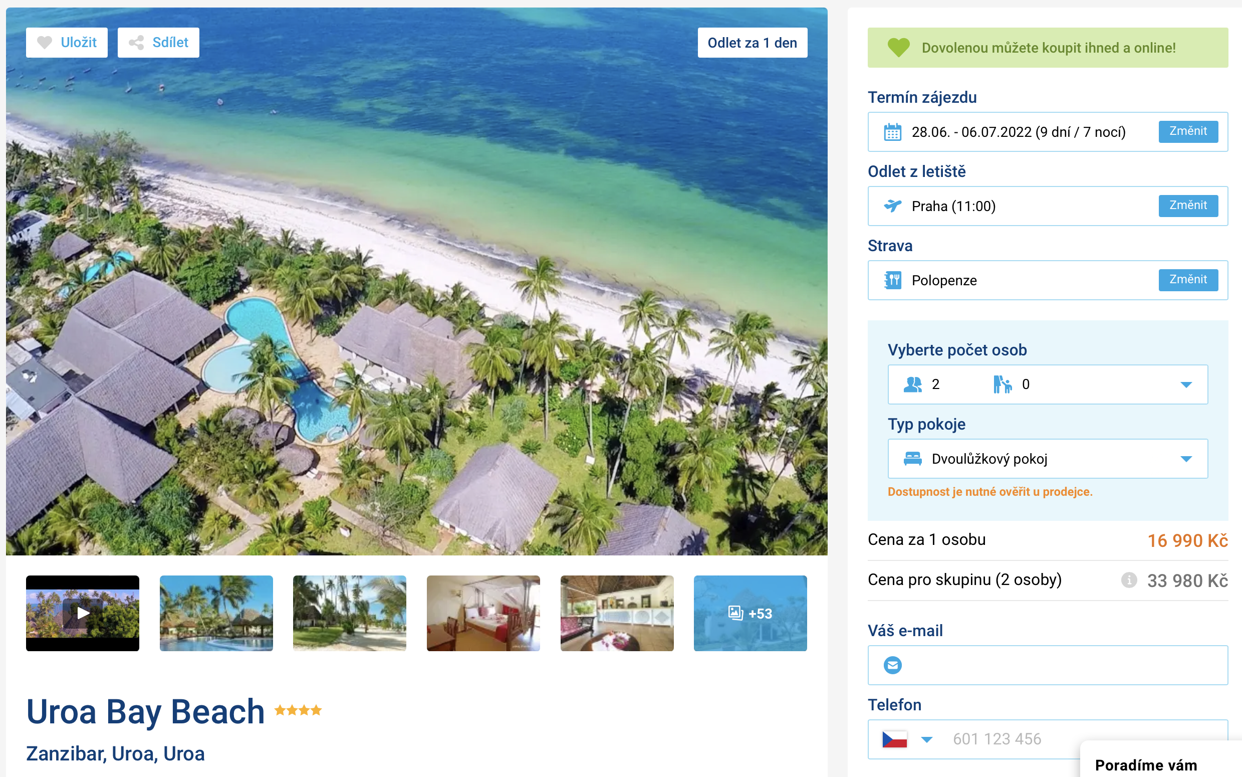 Láká vás exotický Zanzibar? V tom případě by vám neměl uniknout náš další dnešní tip. Dovolenou ve 4* hotelu a letovisku Uroa můžete aktuálně pořídit za cenu 16 990 Kč. V této ceně jsou zahrnuty letenky (s odletem z Prahy), letištní transfery v místě, ubytování na 7 nocí, stravování formou polopenze a služby delegáta.Výborně hodnocený hotel se nachází přímo u pláže s jemným bílým pískem. S rezervací zájezdu příliš dlouho neváhejte, odlet je již zítra dopoledne.