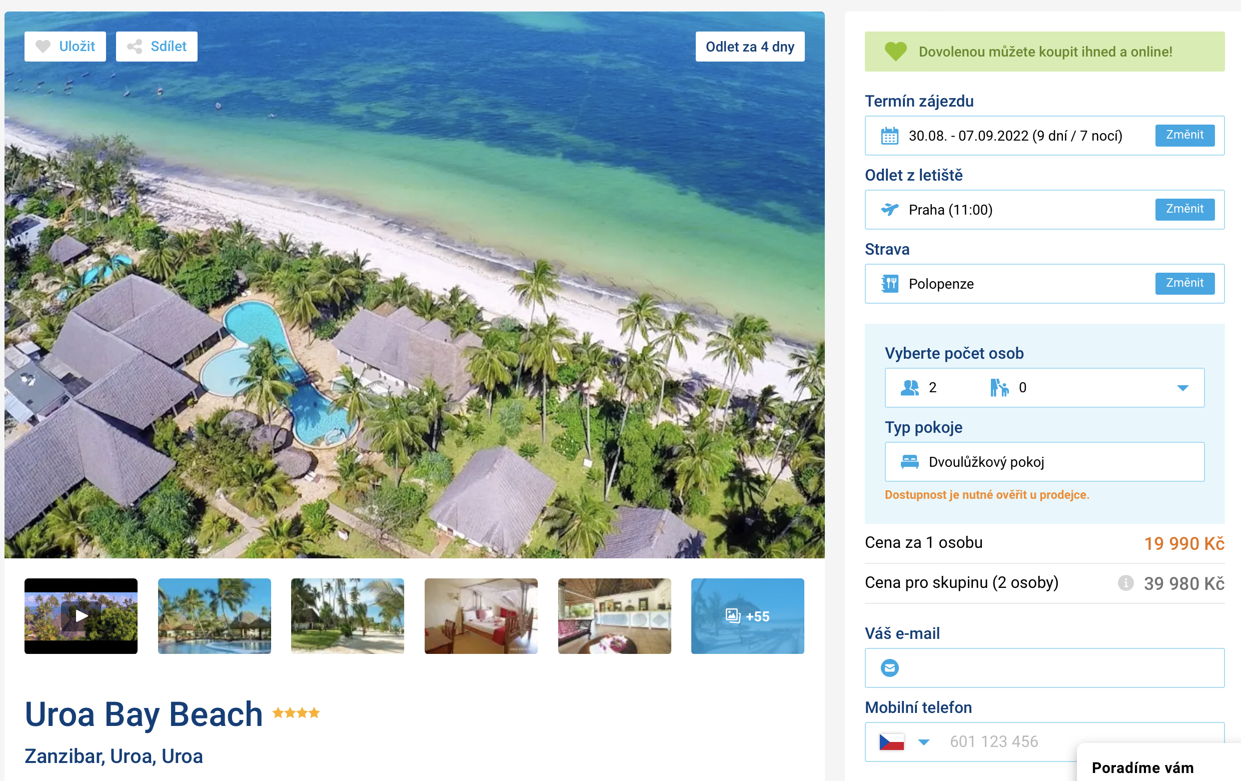 Láká vás exotický Zanzibar? Zájezd do 4* hotelu Uroa Bay Beach s polopenzí můžete aktuálně rezervovat za last minute cenu 19 990 Kč. Tato cena dále zahrnuje letenky (odlet z Prahy), letištní transfery v místě, ubytování na 7 nocí a služby delegáta. Pokud preferujete all inclusive stravování, zájezd v této variantě pořídíte za cenu 23 990 Kč. Hotel leží přímo u krásné písečné pláže s pozvolným vstupem do moře.