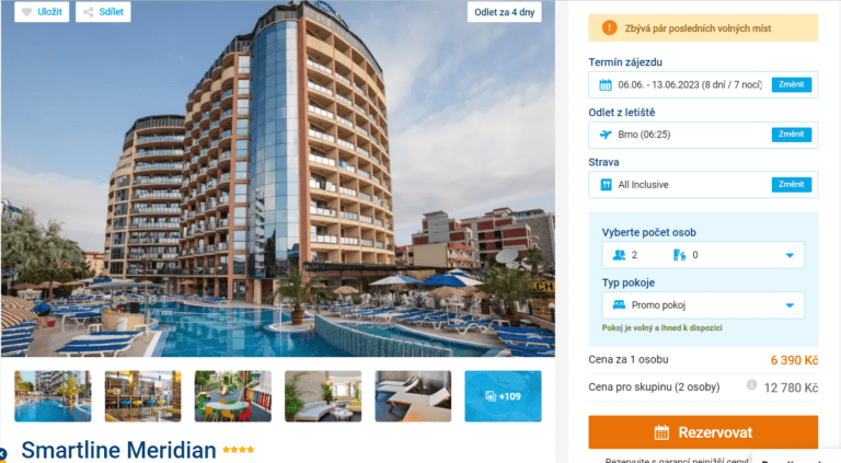 Vybíráte rodinnou dovolenou, ale preferovali byste odlet z Brna? Pokud máte v hledáčku destinací i Bulharsko, uděláme vám radost následujícím tipem! V akční nabídce cestovní kanceláře se totiž objevil pobyt na Slunečném pobřeží za 6390 Kč. Cena zahrnuje ubytování ve 4* hotelu, zpáteční letenky s odletem z Brna, letištní transfery, stravu All Inclusive a služby delegáta. Hotel Smartline Meridian leží jen 300m od centra, kde můžete navštívit obchůdky, kavárny i restaurace. Pro děti je přímo u hotelu vybudováno dětské hřiště a oddělený bazén se skluzavkou. Dospělí se mohou zrelaxovat ve wellness.