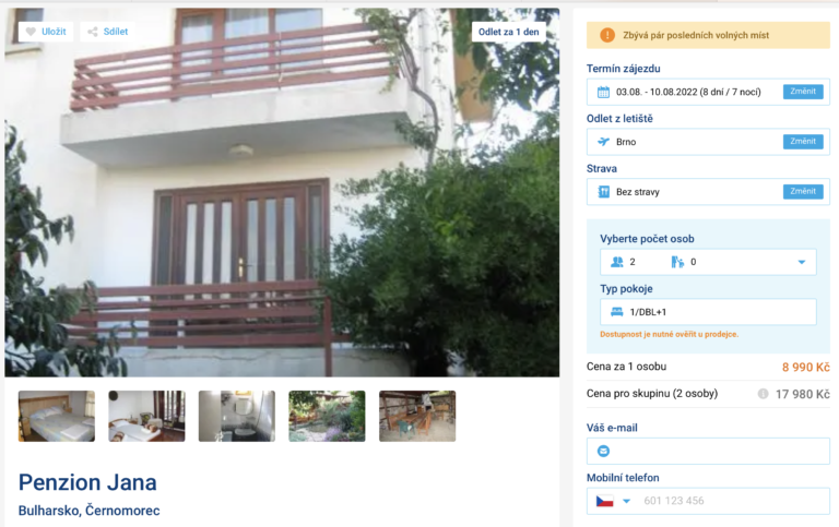 Hledáte dovolenou na poslední chvíli a láká vás Bulharsko? S naším dalším dnešním tipem můžete zítra zamířit do letoviska Černomorec. Oblíbený penzion Jana se nachází asi 5 minut chůze od městské pláže a nabízí příjemnou rodinnou atmosféru. Dovolenou v tomto penzionu můžete aktuálně pořídit za cenu 8 990 Kč. V ceně jsou zahrnuty letenky (odlet z Brna/ Ostravy), letištní transfery v místě, ubytování na 7 nocí a služby delegáta. Před cestou se nezapomeňte inspirovat v našem podrobném průvodci Bulharskem, ve kterém najdete rady pro vaši cestu a tipy na výlety.