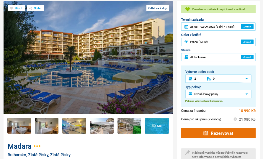 Máte v hledáčku dovolenou v Bulharsku, ale zatím jste si nekoupili žádný zájezd? Pak by vám mohl přijít vhod následující tip, ve kterém vám ukážeme výhodnou Last Minute nabídku. Cena 10 990 Kč zahrnuje ubytování ve 4* hotelu na 8 dní, stravu All Inclusive, zpáteční letenky z Prahy, letištní transfery a služby delegáta. Hotel Madara stojí v letovisku Zlaté Písky a písečná pláž je vzdálena jen 400m. Před cestou se nezapomeňte inspirovat v našem online průvodci Bulharskem, ve kterém najdete tipy na výlety a informace o jednotlivých letoviscích.