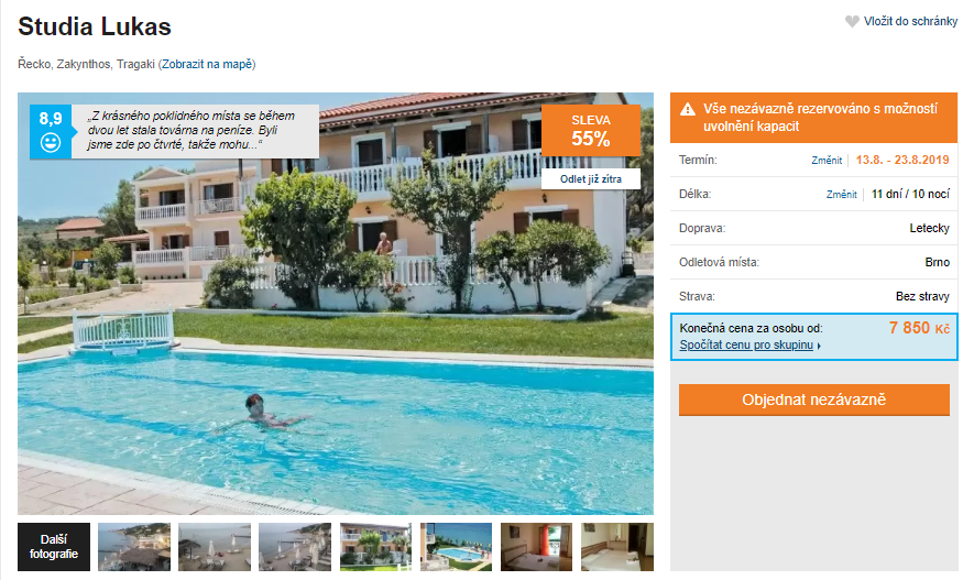 Pokud jste ještě nikdy nebyli na řeckém ostrově Zakynthos, tak neváhejte a využijte této velmi výhodné nabídky. Tento zájezd vás vezme na nezapomenutelných 11 dní do příjemného letoviska Tragaki. Ubytováni budete ve velmi dobře hodnoceném hotelu, který je hned vedle krásné písčito-oblázkové pláže. Ta se postupně svažuje až do průzračně čistého moře. Za částku 7850 Kč získáte kompletní dovolenou – zpáteční letenky s odletem z Brna, dopravu z letiště do vašeho hotelu a zpět, služby delegáta a ubytování. Pokud vás tento zájezd zaujal, tak příliš dlouho neotálejte, místa rychle mizí! Inspiraci na cestu můžete načerpat v našem podrobném průvodci po ostrově Zakynthos, který je k přečtení zcela zdarma.