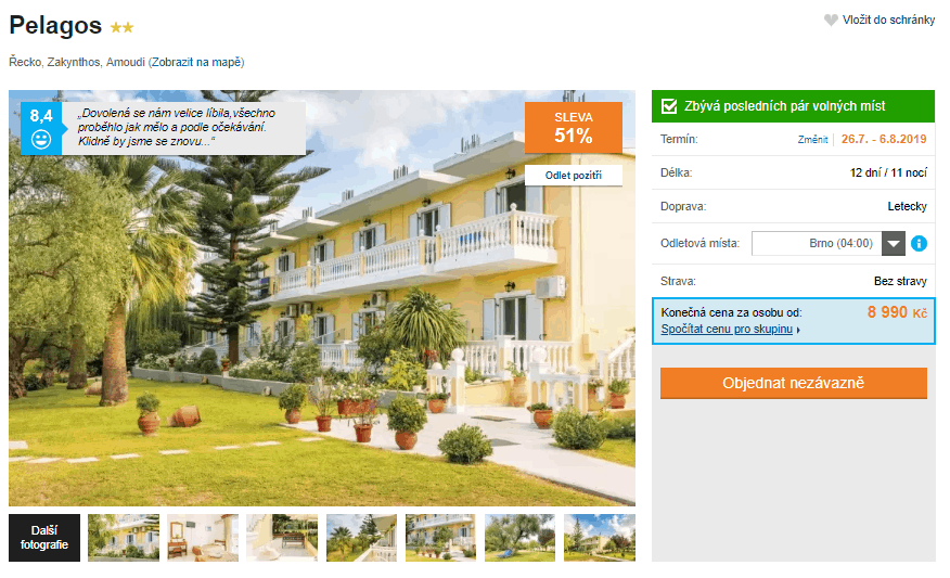 Toužíte po klidné dovolené v malém městečku, kde si budete moci konečně kvalitně odpočinou od každodenního stresu? Tento výrazně zlevněný zájezd vás vezme na dvanáct dní na vyhlášený řecký ostrov Zakynthos. Ubytováni budete v kvalitním hotelu, který je jen pár minut chůze od krásné pláže. Tu pokrývá jemný písek a postupně se svažuje až do průzračně čisté vody. Za částku 8990 Kč získáte kompletní dovolenou – zpáteční letenky s odletem z Prahy či Brna, dopravu z letiště do vašeho hotelu a zpět, služby delegáta a ubytování. Pokud vás tento zájezd zaujal, tak příliš dlouho neotálejte, místa rychle mizí! Inspiraci na cestu můžete načerpat v našem podrobném průvodci po ostrově Zakynthos, který je k přečtení zcela zdarma.