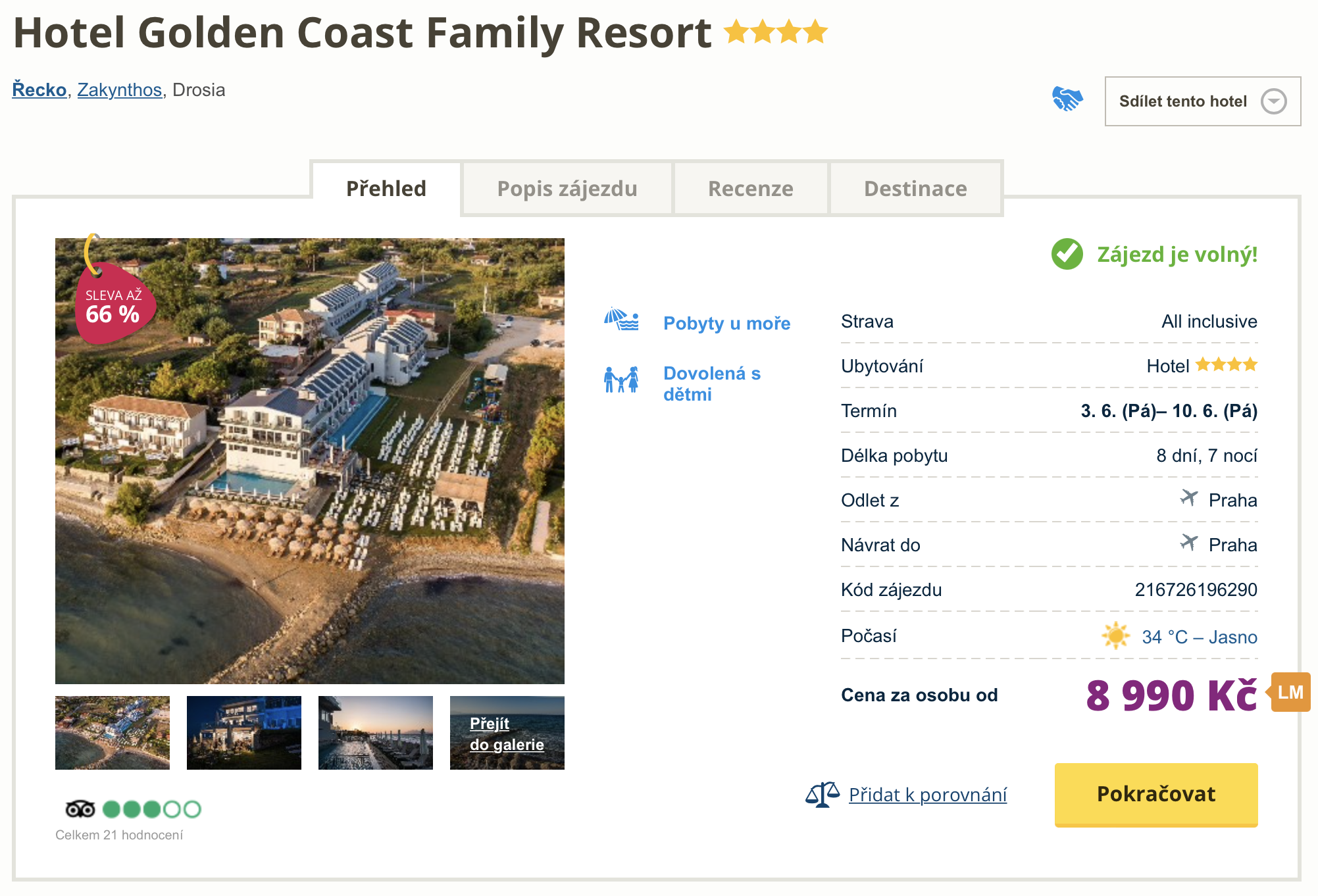 I s naším dalším dnešním tipem můžete zamířit na krásný řecký ostrov Zakynthos! V nabídce cestovních kanceláří se objevil last minute zájezd do do 4* hotelu a letoviska Drosia za cenu 8 990 Kč. Tato cena zahrnuje zpáteční letenku z Prahy, letištní transfery v místě, ubytování na 7 nocí, stravování formou all inclusive a služby delegáta. Hotel leží přímo u oblázkovo-kamenité pláže s pozvolným vstupem do moře. Před odletem určitě nahlédněte do našeho podrobného online průvodce Zakynthosem, ve kterém najdete tipy na výlety.