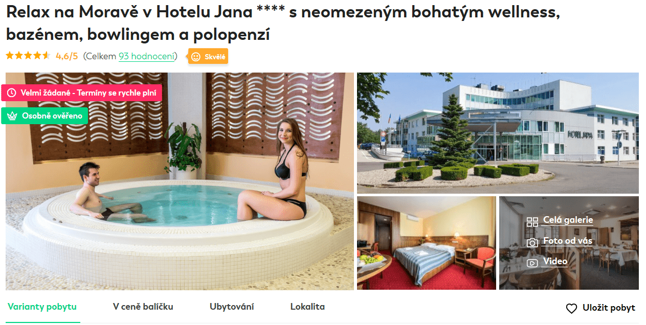 Hurá na Moravu! Konkrétně pak do Prostějova, ležícího nedaleko krásné Olomouce. Přímo zde si můžete již za 1790 Kč/2 osoby užít pobyt v luxusním hotelu Jana, a to na 1 noc s polopenzí, neomezeným vstupem do wellness, bazénu, ale i na bowling, šipky či ping pong. Poukaz v této ceně je možné využít pouze při nástupu v neděli či v pondělí. Alternativně však zakoupíte pobyty s nástupem kdykoli na až 7 nocí. Všechny varianty poukazu je ale nutné využít do 20. prosince.