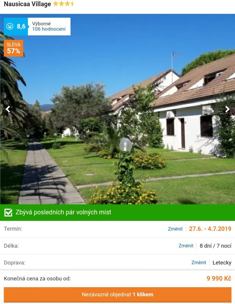 Stále se nemůžete rozhodnout, kam se vydat na letní dovolenou? Na jih Itálie se nyní můžete díky výhodné nabídce podívat už za 9990 Kč. Zájezd je přes cestovní kancelář, za tuto cenu tak získáte kompletní dovolenou, tedy zpáteční letenky z Prahy, dopravu na hotel v místě pobytu, služby česky mluvícího delegáta, ubytování v příjemném hotelu a stravování formou light all inclusive.