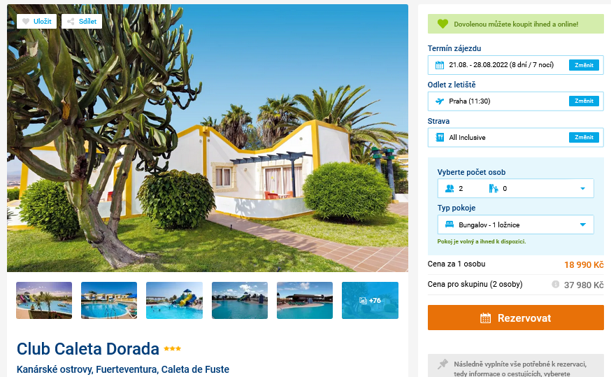 Jste klidnější, když máte dovolenou naplánovanou dostatečným předstihem? Pokud nejste žádnými vyznavači Last Minute pobytů, je následující příspěvek určen právě pro vás! V něm vám ukážeme pobyt na ostrově Fuerteventura, který pořídíte u cestovní kanceláře Invia. Termín zájezdu je až 21.8. – 28.8.2022 a za cenu 18 990 Kč budete mít zajištěno ubytování v hotelu na 8 dní, stravu All Inclusive, zpáteční letenky z Prahy, letištní transfery a služby delegáta. Hotel Club Caleta Dorada leží ve vyhlášeném letovisku Caleta de Fuste, jen 800m od stejnojmenné exotické pláže. V blízkosti najdete i nádherný přístav, obchody, bary a restaurace. Inspiraci na výlety a informace o ostrově najdete v našem podrobném průvodci Fuerteventurou