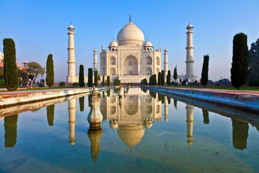 - Taj Mahal – nejznámější památka v zemi, je to monumentální pomník v Agře. Nechal ho vystavět indický mogul Šáhdžahán na památku své předčasně zesnulé ženy. Od roku 1983 je Taj Mahal zapsán na seznamu světového dědictví UNESCO. V různé denní hodiny za různého osvětlení má zajímavé a pokaždé jiné zbarvení. Ráno je barva narůžovělá, navečer mléčně bílá a zlatou se stává vždy navečer za svitu měsíce.