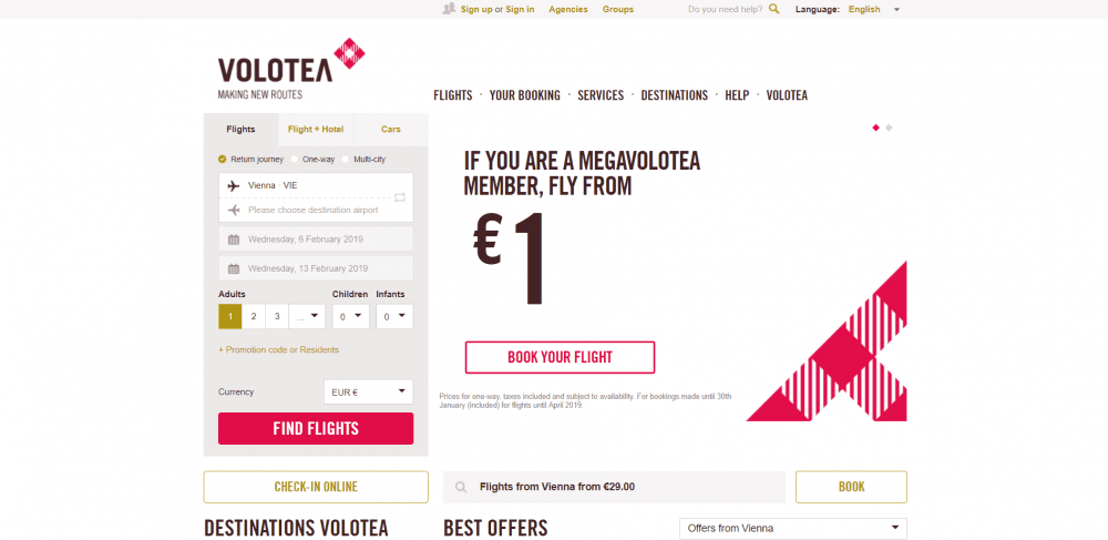 Na webových stránkách Volotea si jednoduše a rychle zakoupíte letenky. Zadejte místo odletu a příletu, datum a počet osob. Můžete také využít speciální služby a najít si vhodnou kombinaci letenky a hotelu (Flight+Hotel) nebo si pronajmout automobil.
